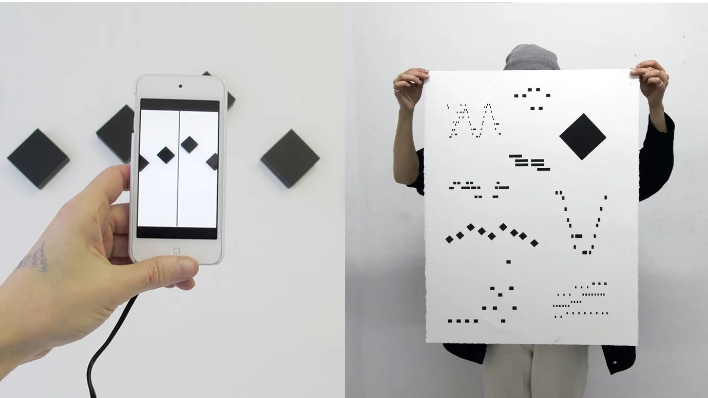 Format 1 is a series of installations that map the mathematical relationship between sound waves to physical planes and space, as a way to understand and 'look at' sound. The format No. 1 iPhone app functions as an optical synthesizer - turning black pixels into musical scale. The project is inspired by optical sound experiments from history such as the Russian futurist ANS synthesizer and graphics patterns are appropriated from various notation systems from history. Format No. 1 has been shown at Pioneer Works, REVERSE Space, C-4 Projects and Telfair Museums, Savannah